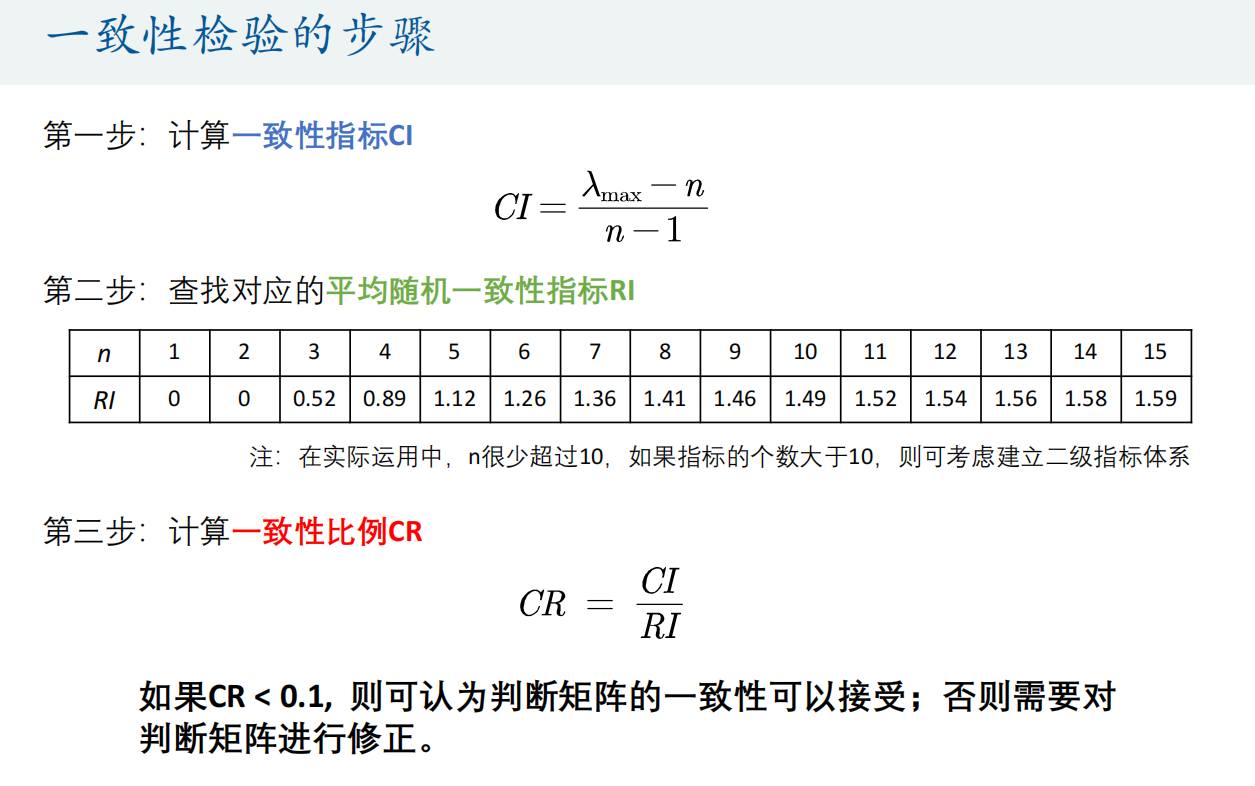 (1)评价的决策层不能太多,太多的话n会很大,判断矩阵和一致矩阵差异可能会很大。